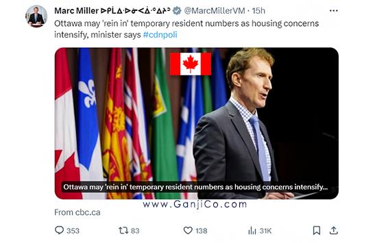 مارک میلر، وزیر مهاجرت کانادا، در کنفرانسی در وینیپگ، مانیتوبا در تاریخ 13 ژانویه 2024 اعلام کرد کانادا در حال بررسی اعمال محدودیتی برای پذیرش در تعداد دانشجویان بین المللی است، زیرا دولت به دلیل بحران قیمت مسکن با انتقاد مواجه است. فیلم آن را در اینستاگرام گنجی ببینید.داده های رسمی نشان می دهد که در سال 2022 بیش از 800هزار دانشجوی خارجی با ویزای فعال در کانادا وجود داشته است که این عدد در سال 2012 تنها 275000 دانشجو بوده است.